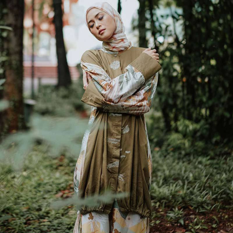 Tampil lebih cantik dengan Ria Miranda Morikuru Series Kanki Tunik sebagai atasannya. Sementara untuk roknya kamu bisa mencari warna yang senada dengan bentuk yang nggak terlalu lebar. Padukan dengan jilbab segiempat yang diikat ke bagian belakang dan kacamata untuk mempertegas kesan vintage.