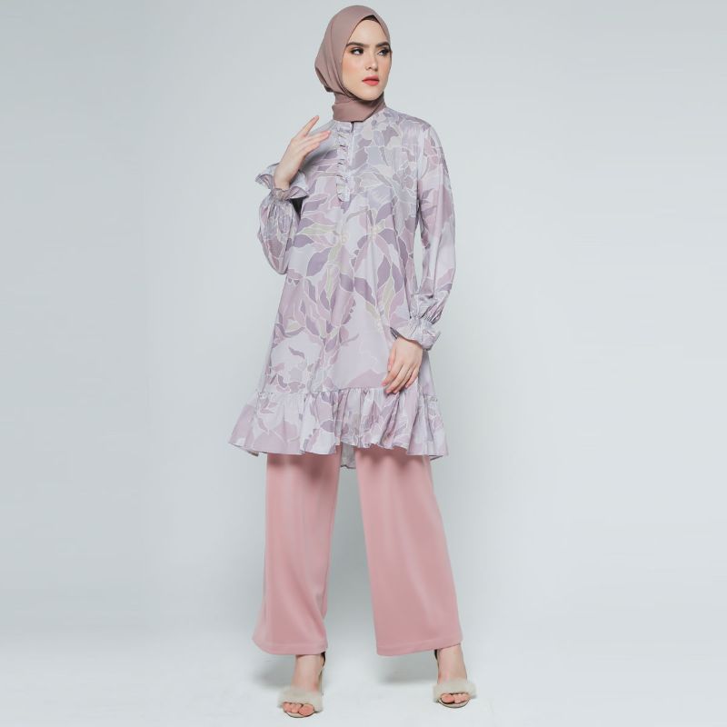Biar nggak nabrak kamu bisa memadukan pakaian dan bawahan yang lebih simpel seperti Puru Kambera Sharon Series Shadow Lilac Tunic. Tunik ini simpel namun sangat elegan dan kamu bisa memadukannya dengan bawahan berupa rok panjang maupun kulot warna putih. Tampilan ini cocok untuk semua jenis acara yang kamu datangi.